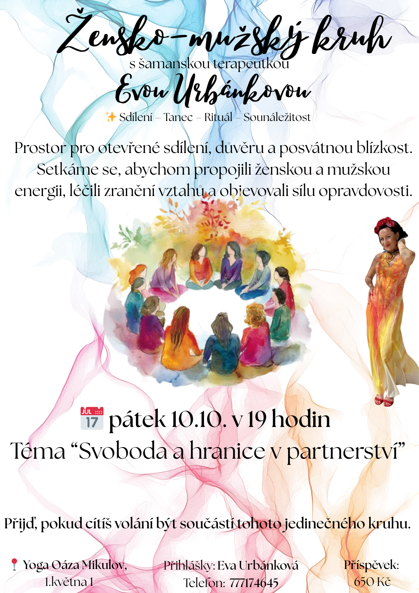 Prostor pro sdílení, tanec, meditaci a vědomé setkávání Toužíš po komunitě, kde vládne důvěra, autenticita a sounáležitost? Zveme tě na první setkání, kde se potkají ženy i muži, otevřou své srdce a společně začneme tvořit vědomou komunitu. Žensko-mužský kruh ✨ Setkání, kde se rodí důvěra a vzájemnost ✨ V bezpečném prostoru se otevíráme dialogu mezi ženou a mužem. Sdílíme své příběhy, léčíme stará zranění a učíme se naslouchat z hloubky srdce. Kruh přináší inspiraci, podporu a možnost tvořit vědomé vztahy v souladu a lásce. Průvodkyně: Eva Urbánková – artfashion designérka, malířka a šamanská průvodkyně.