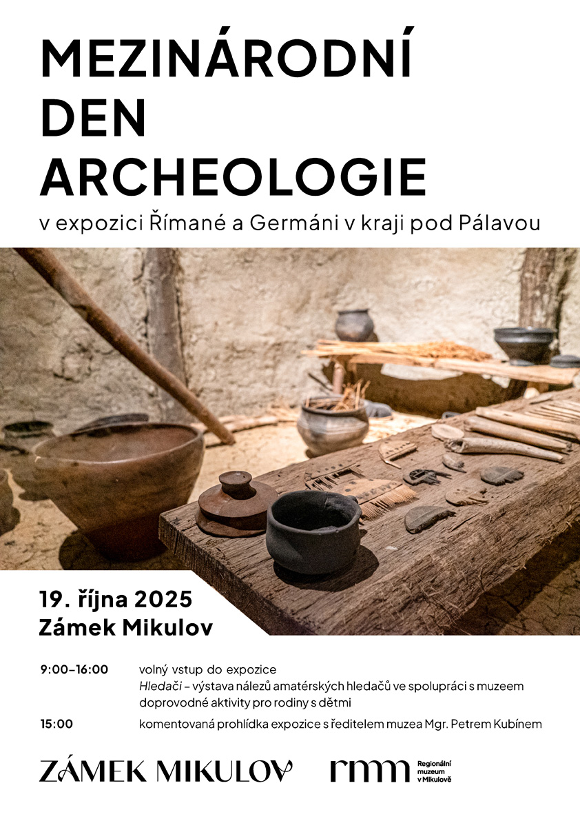 Do mezinárodní oslavy archeologického bádání, která každoročně připadá na třetí říjnovou sobotu, se tradičně zapojuje i zámek Mikulov se svou archeologickou expozicí "Římané a Germáni v kraji pod Pálavou". Od 9 do 16 hodin budete moci navštívit expozici zdarma, navíc je připraven doprovodný program. V 15 hodin začíná komentovaná prohlídka expozice s ředitelem muzea Petrem Kubínem. Připravena bude již tradičně prezentace předmětů nalezených amatérskými hledači ve spolupráci s Regionálním muzeem v Mikulově. Program myslí i na malé badatele, kteří se budou moci hravou formou seznámit s římskou kulturou a s kulturou germánských kmenů.