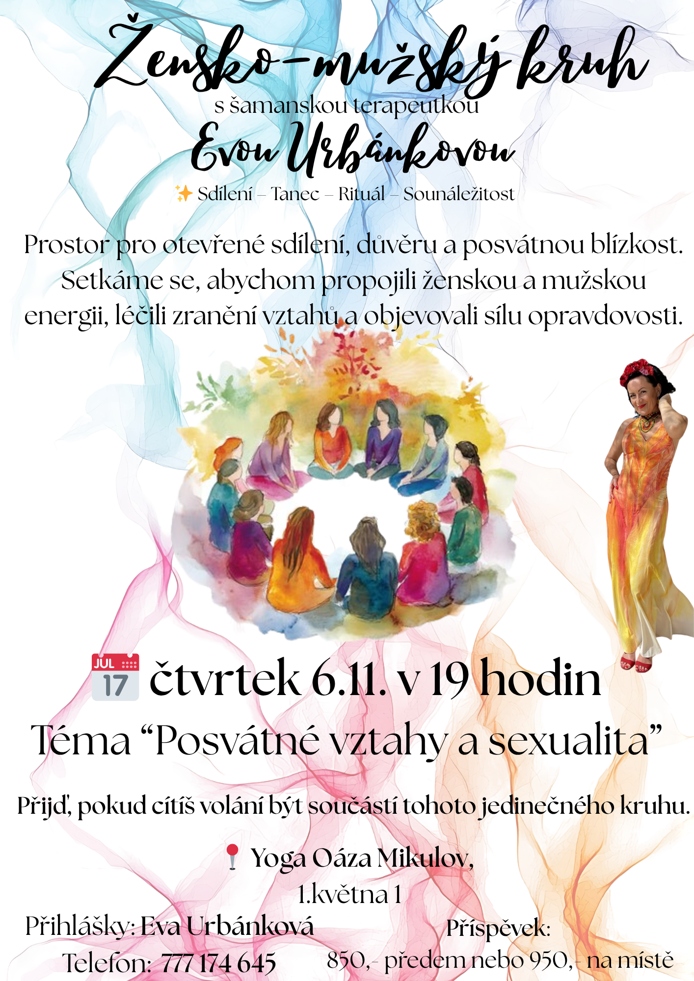Prostor pro otevřené sdílení, důvěru a posvátnou blízkost. Setkáme se, abychom propojili ženskou a mužskou energii, léčili zranění vztahů a objevovali sílu opravdovosti. Téma 2. setkání: "POSVÁTNÉ VZTAHY A SEXUALITA", pokud cítíš volání být součástí jedinečného kruhu sdílení. Tentokrát prodloužený čas na 3 hodiny. ✨ Co nás čeká: sdílení o vztazích a intimitě péče s olejem na probuzení posvátné sexuality krátká šamanská meditace na otevření posvátné sexuality spontánní tanec spojení prostor pro otevřený dialog o tom, jakou komunitu chceme tvořit 📅 Kdy: 6.11.2025 v 19 hodin