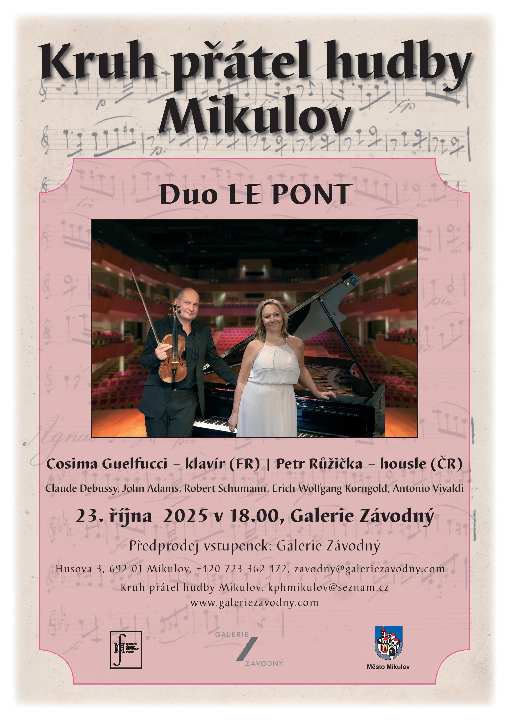 Duo "Le Pont" (Most) spojuje vytříbený vkus a slovanskou hudební tradici houslisty, violisty a skladatele Petra Růžičky s citlivostí a elegancí francouzské klavíristky z Avignonu, Cosimy Guelfucci. Jejich repertoár, sahající od velkých klasiků až po současná díla, odráží toto mezikulturní setkání a nabízí posluchačům jedinečný hudební zážitek. Na své první česko-slovenské turné si vybrali skladby s výrazným mimohudebním podtextem: poezii pro Debussyho skladby, divadelní hru v případě brněnského rodáka Korngolda, svébytný styl amerického filmu (Road movie) v hudbě žijícího skladatele J. Adamse, malířství v expresi Schumannovy Sonáty a nakonec meteorologický a naturalistický aspekt v barokně-hudební kompozici Vivaldiho Zimy. Některé skladby a aranžmá zazní v našich zemích úplně poprvé.