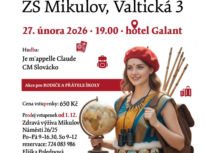 Cena vstupenky 650 Kč, prodej vstupenek: Zdravá výživa Mikulov, Náměstí 26/25, Po-Pá 9-16:30, So 9-12, rezervace: 724083986 Eliška Polednová Začátek plesu 27.2: v 19:00 v Hotelu Galant