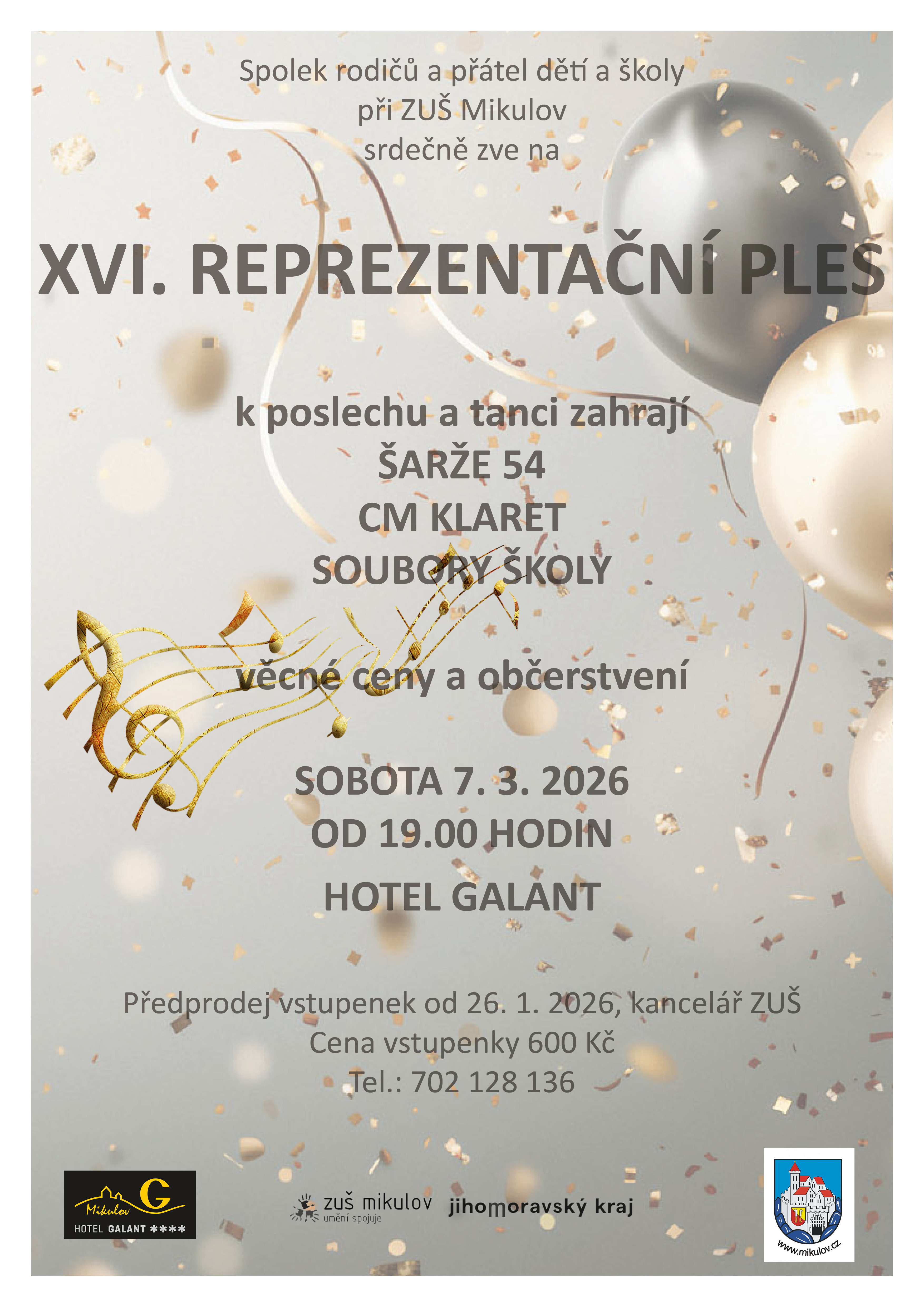Reprezentační ples ZUŠ Mikulov. Akce se koná v Hotelu Galant od 19.00 hodin.